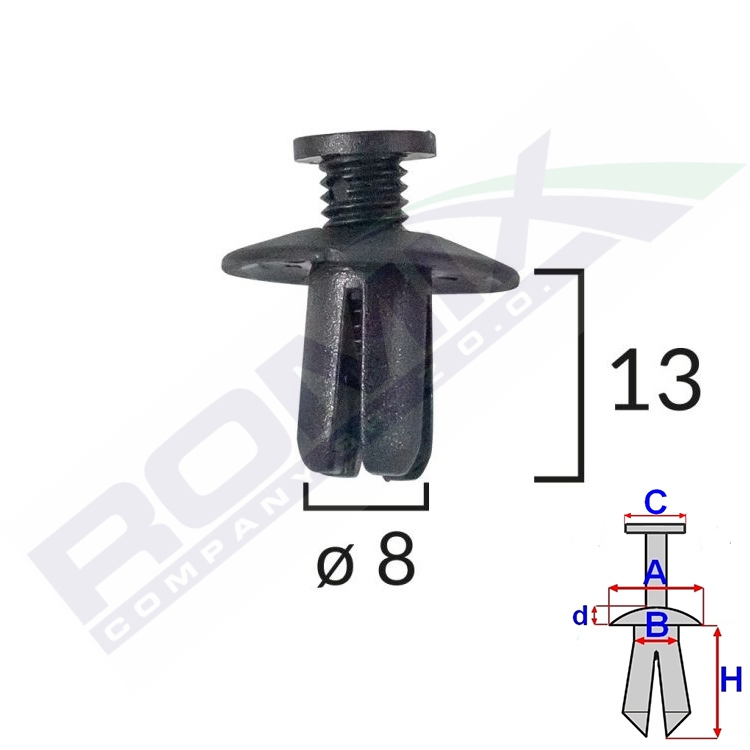Dimensions: A 19,7 B 8,2 C 9,4 d 2,6 H 13 w otwór ø 8