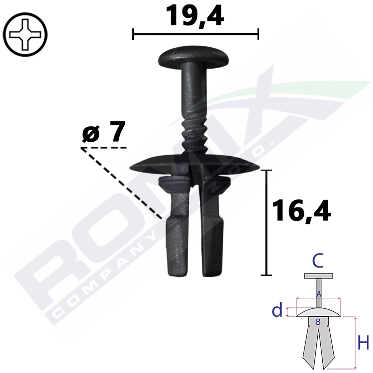A 19,4 B 6,9 C 10,7 d 2,2 H 16,4 w otwór ø 7