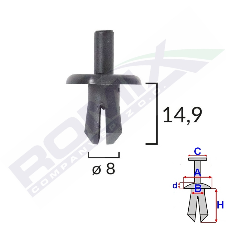 A 18,8 B 8 C 4,9 d 2,6 H 14,9 w otwór ø 8
