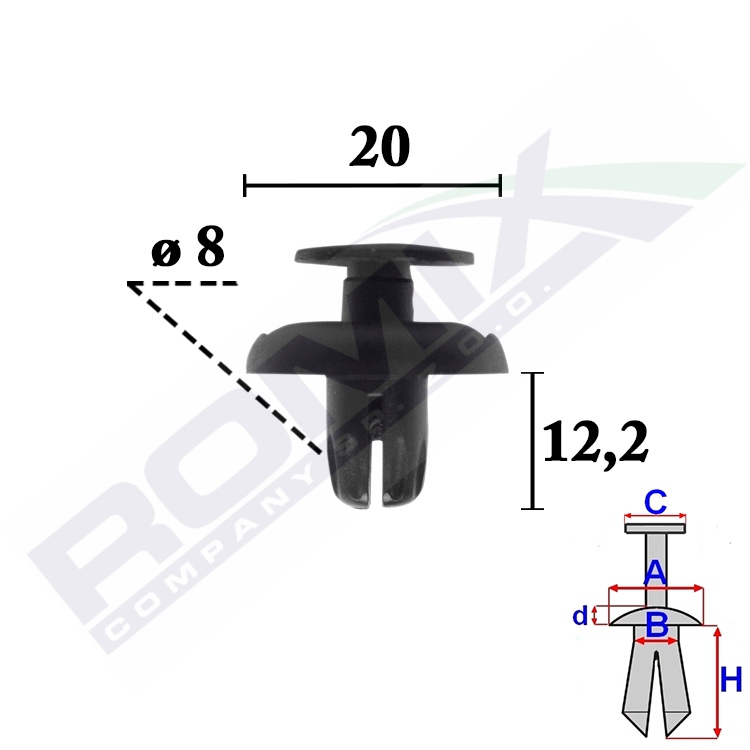 A 20 B 7,9 C 13,7 d 4 H 12,2 w otwór ø 8