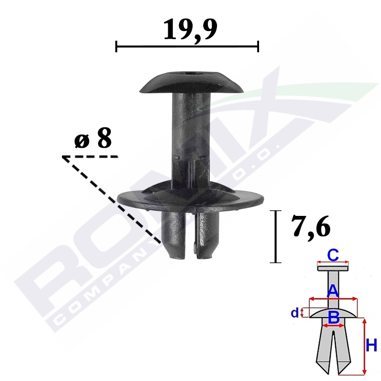 Dimensions: A 19,9 B 8 C 14,2x10,6 d 1 H 7,6 w otwór ø 8