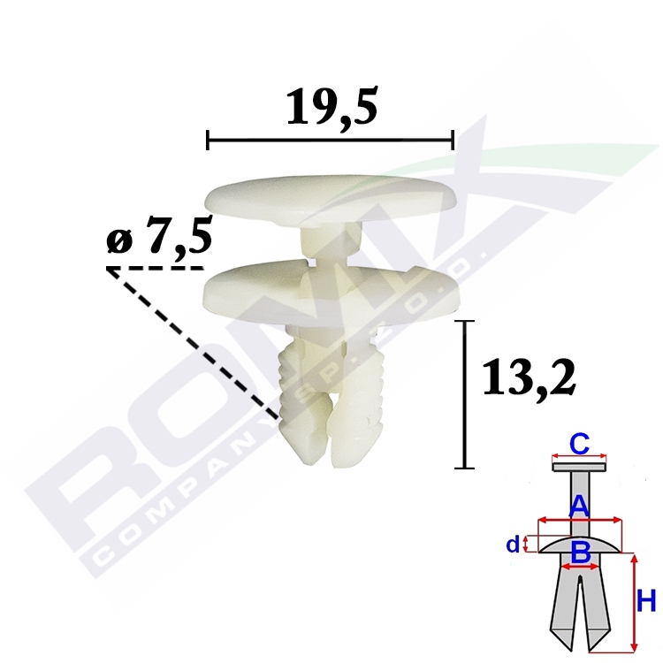 Dimensions: A 20 B 7,2 C 19,5 d 1,5 H 13,2 w otwór ø 7,5