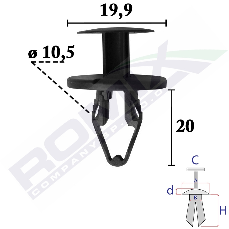 Dimensions: A 24,8 B 10,1 C 19 d 2,5 H 20 w otwór ø 10,5