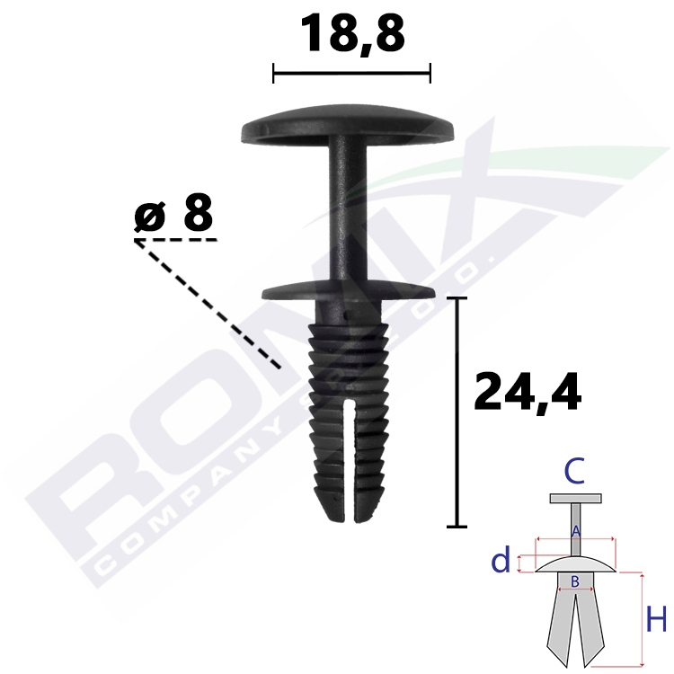 A 18,8 B 7,2 C 23 d 1,9 H 24,4 w otwór ø 8