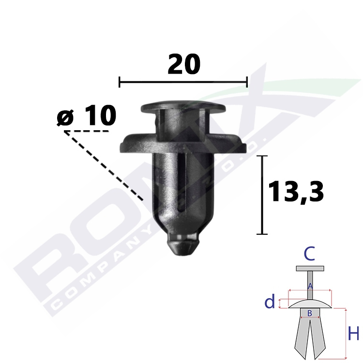A 20 B 9,6 C 13,5 d 3 H 13,3 w otwór ø 10