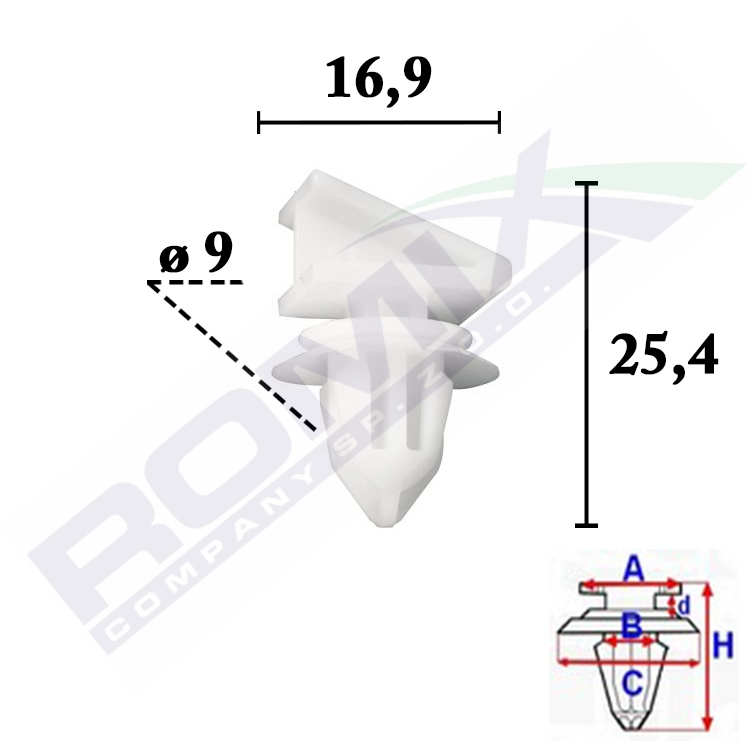 B 9,1 C 16,9 H 25,4 w otwór ø 9