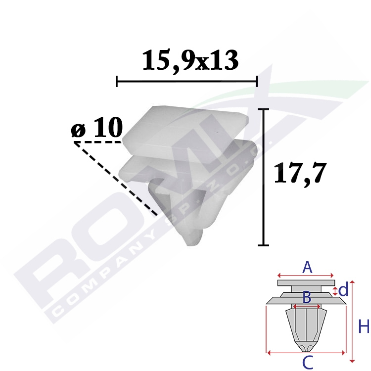 A 13,9x11,9 B 10 C 15,9x13 d 2,4 H 17,7 w otwór ø 10