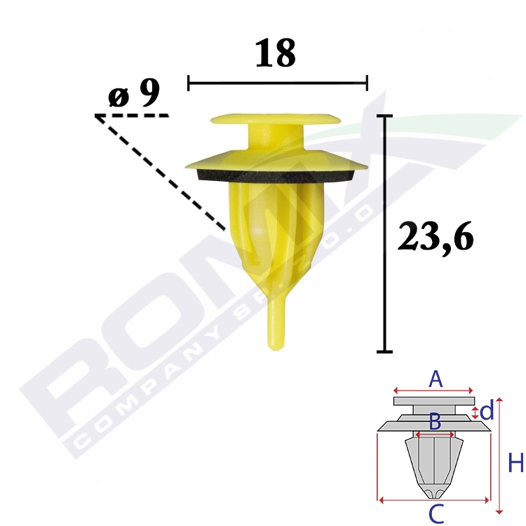 A 12,9 B 9 C 18 d 2,7 H 23,6 w otwór ø 9