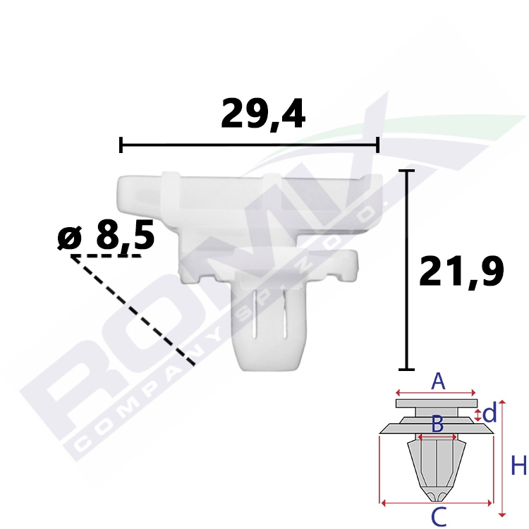 A 29,4 B 8,5 C 20,4 d 2,1 H 21,9 w otwór ø 8,5