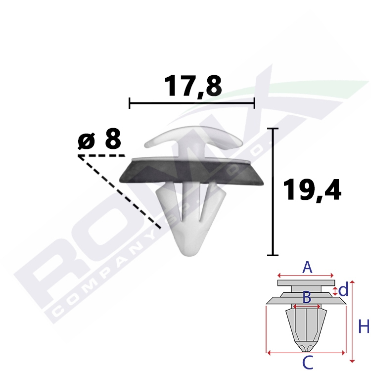 Dimensions: A 16,2 B 7,5 C 17,8 H 19,4 w otwór ø 8