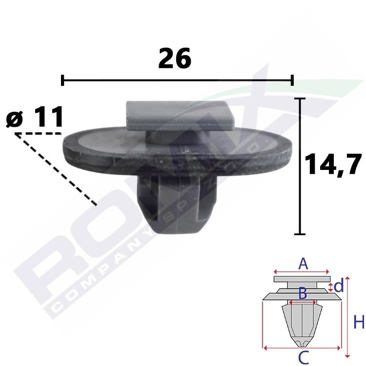 A 11,9x10,2 B 10,9 C 26x17,2 d 2,4 H 14,7 w otwór ø 11