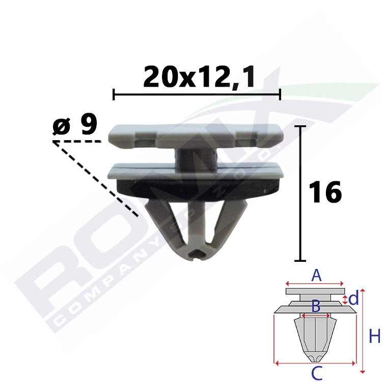 A 20x12,1 B 9,3 C 20,2x12 d 2,8 H 16 w otwór ø 9