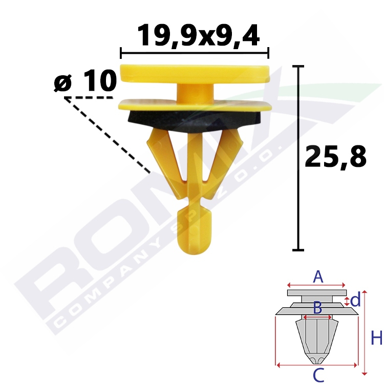 A 19,9x9,4 B 10,2 C 20,1x14 d 3 H 25,8 w otwór ø 10