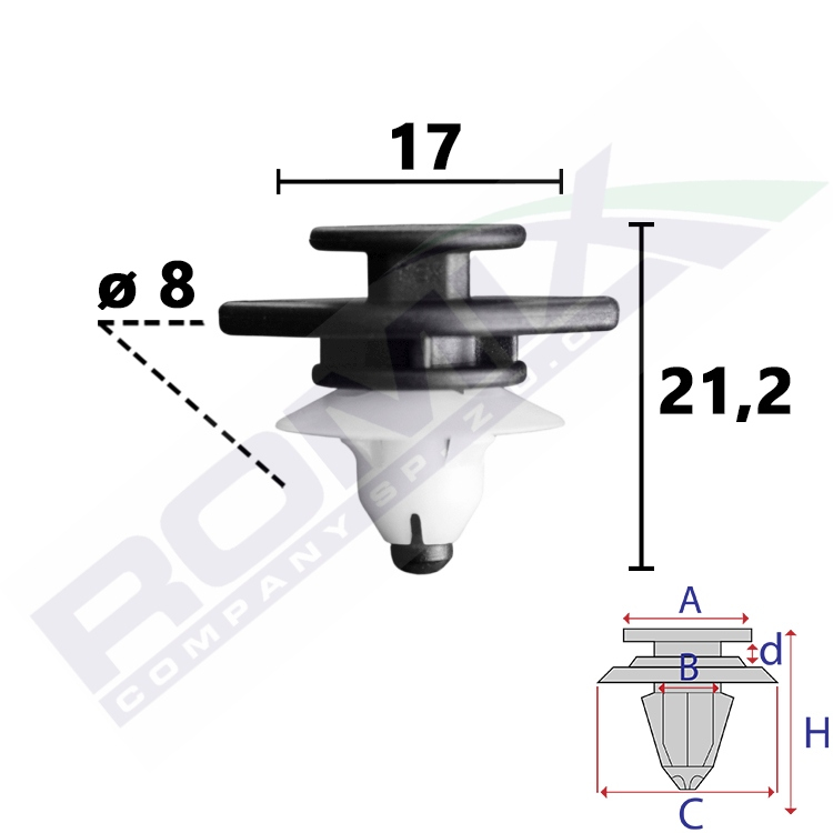 A 13,1 B 7,9 C 17 H 21,2 w otwór ø 8