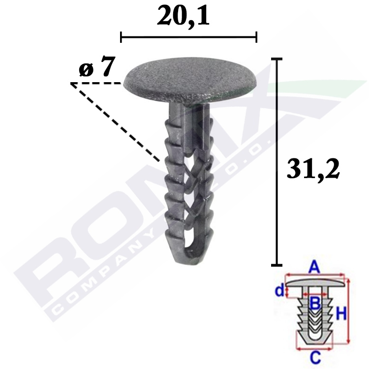 Dimensions: A 20,1 B 7,8 C 7,8 d 5,8 H 31,2 w otwór ø 7