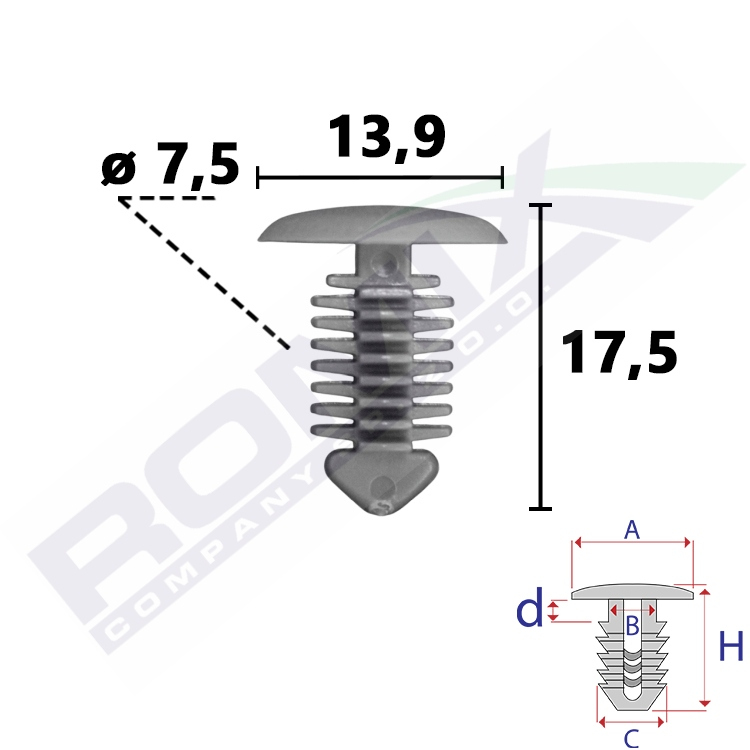Dimensions: A 13,9 B 4 C 7,8 d 2,3 H 17,5 w otwór ø 7,5
