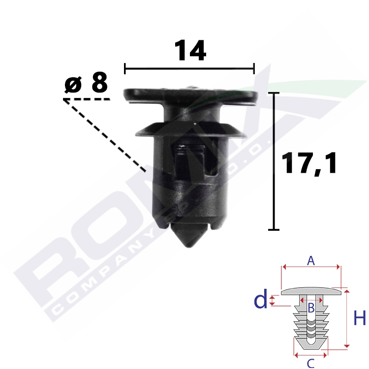 A 14 B 5,9 C 8 d 2,3 H 17,1 w otwór ø 8