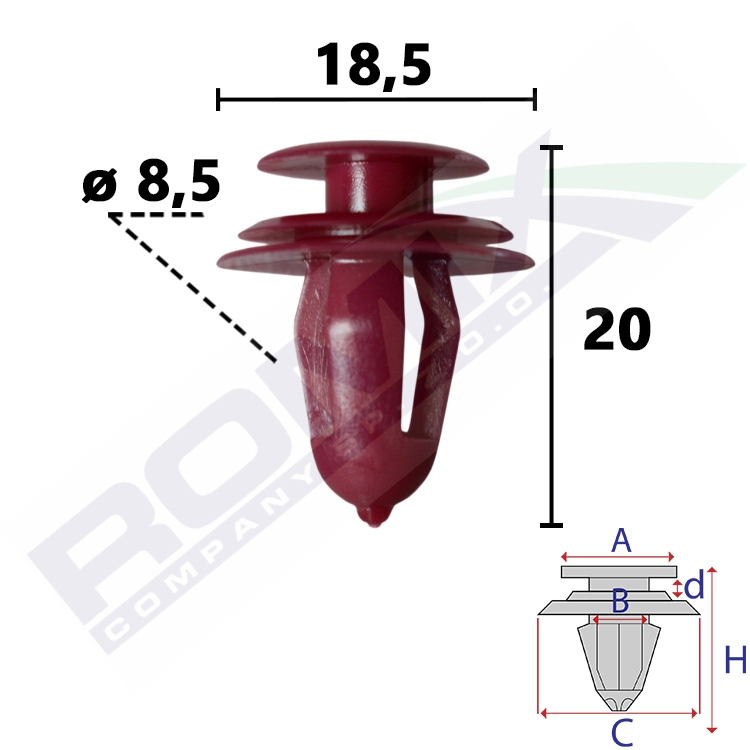 Dimensions: A 13 B 8,5 C 18,5 d 2,6 H 20 w otwór ø 8,5