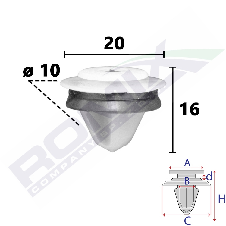 A 13 B 9,6 C 20 d 1 H 16 w otwór ø 10