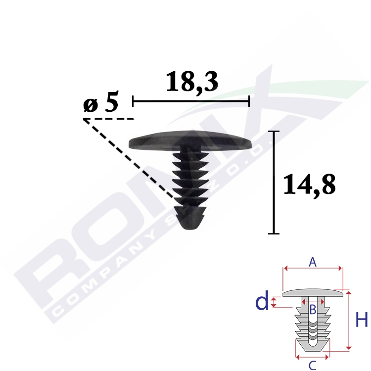 A 18,3 B 3,1 C 5,6 H 14,8 w otwór ø 5