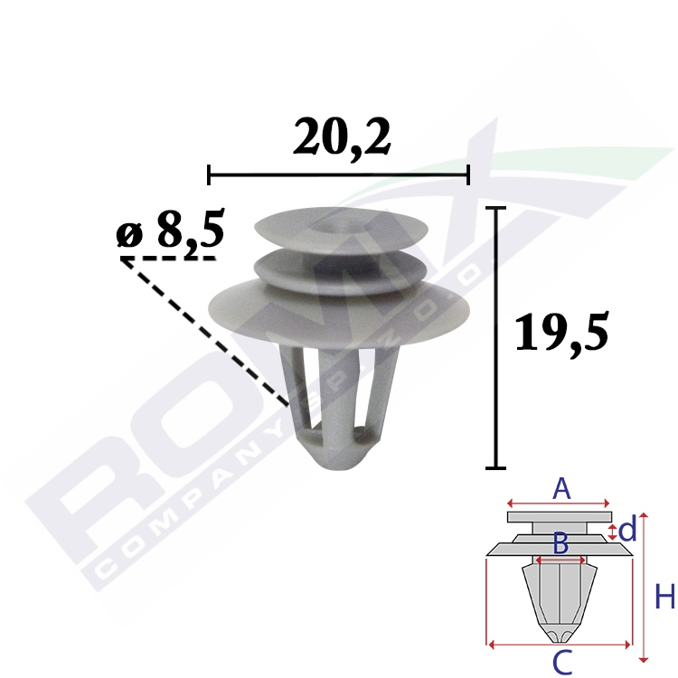 A 13,4 B 8,4 C 20,2 d 2,4 H19,5 w otwór ø 8,5