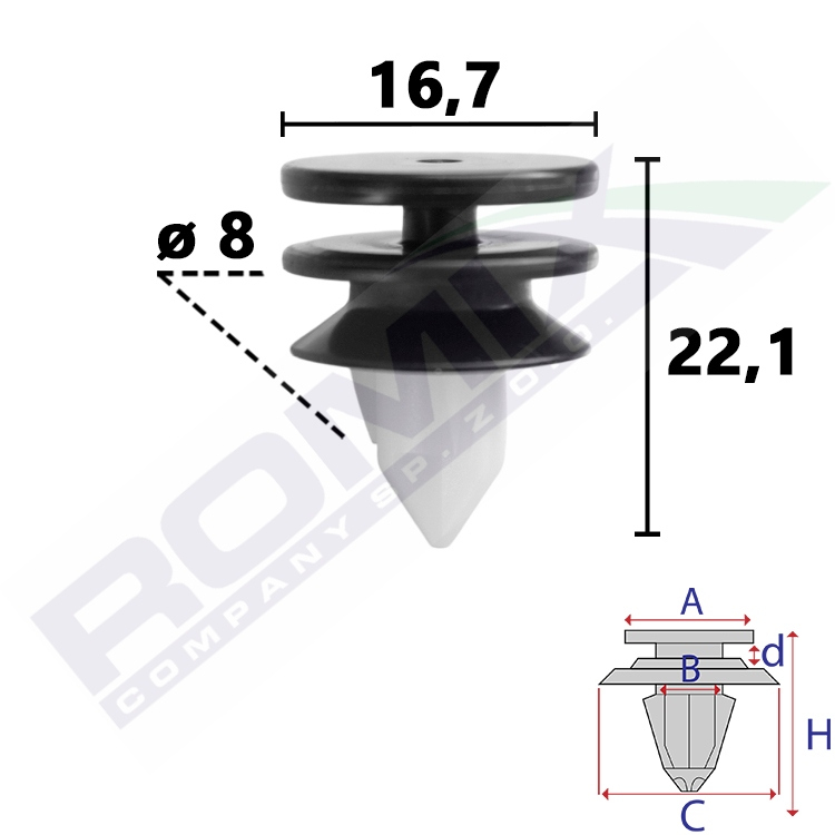 A 17,8 B 8,7 C 16,7 d 3 H 22,1 w otwór ø 8