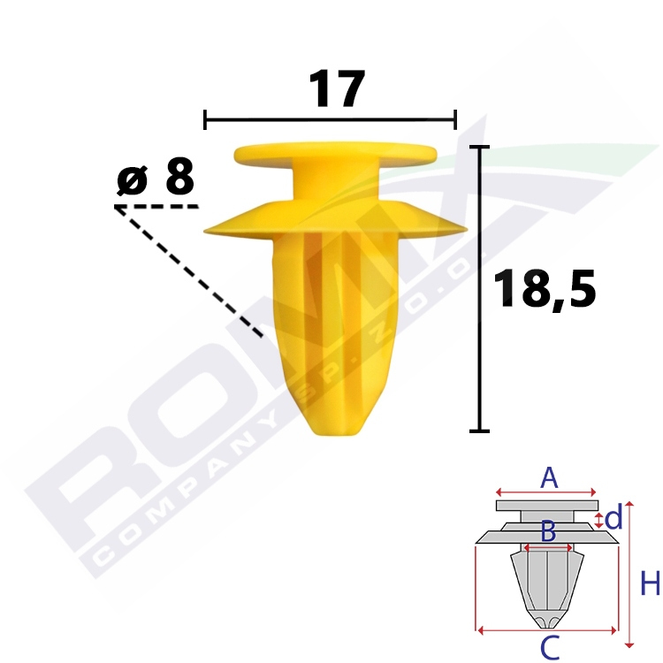 Dimensions: A 13,2 B 8 C 1 d 2,6 H 18,5 w otwór ø 8