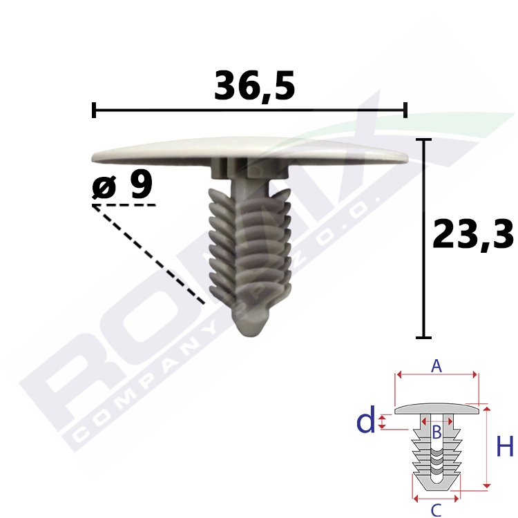 A 36,5 B 9 C 9,5 H 23,3 w otwór ø 9