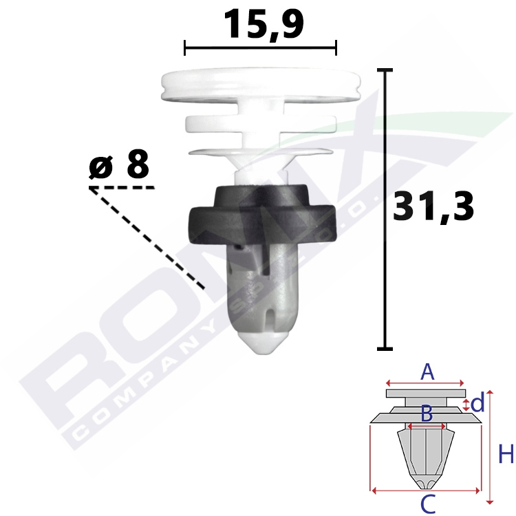 A 21,8 B 7,9 C 15,9 H 31,3 w otwór ø 8