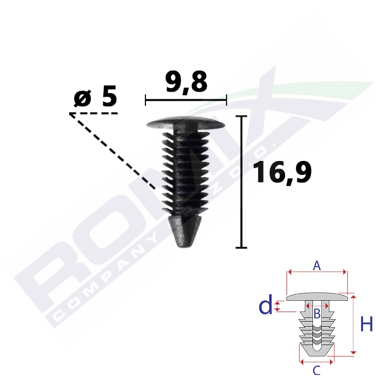 A 9,8 B 3,1 C 5,7 H 16,9 w otwór ø 5