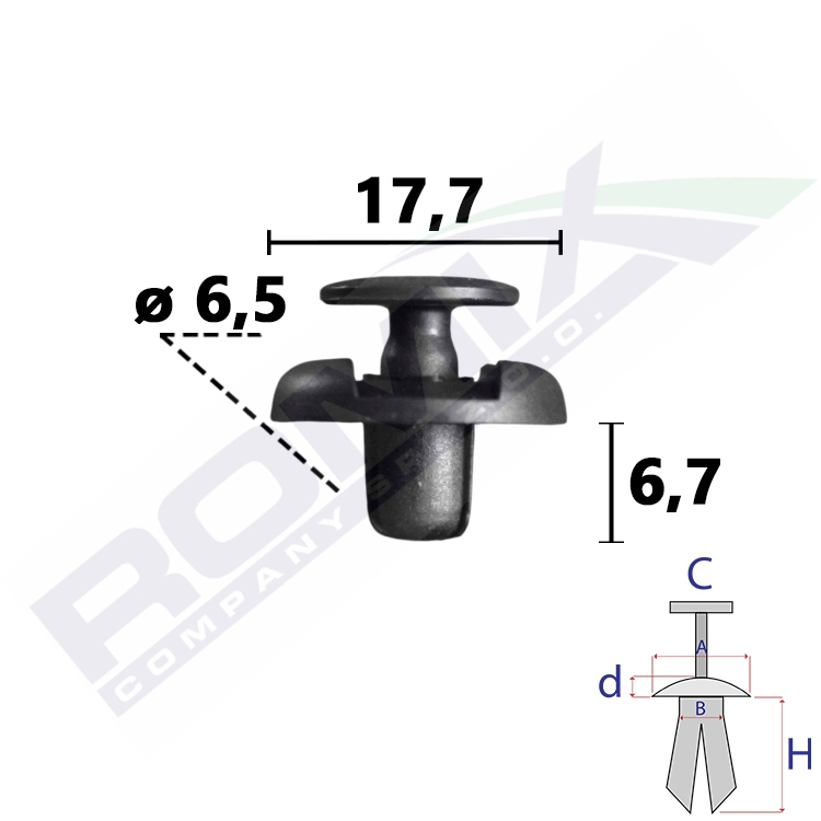 A 17,7 B 6,6 C 11,6 d 3,8 H 6,7 w otwór ø 6,5