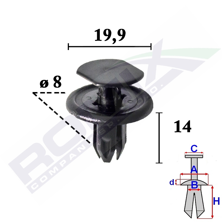 A 19,9 B 7,7 C 15,3x13 d 2 H 14 w otwór ø 8