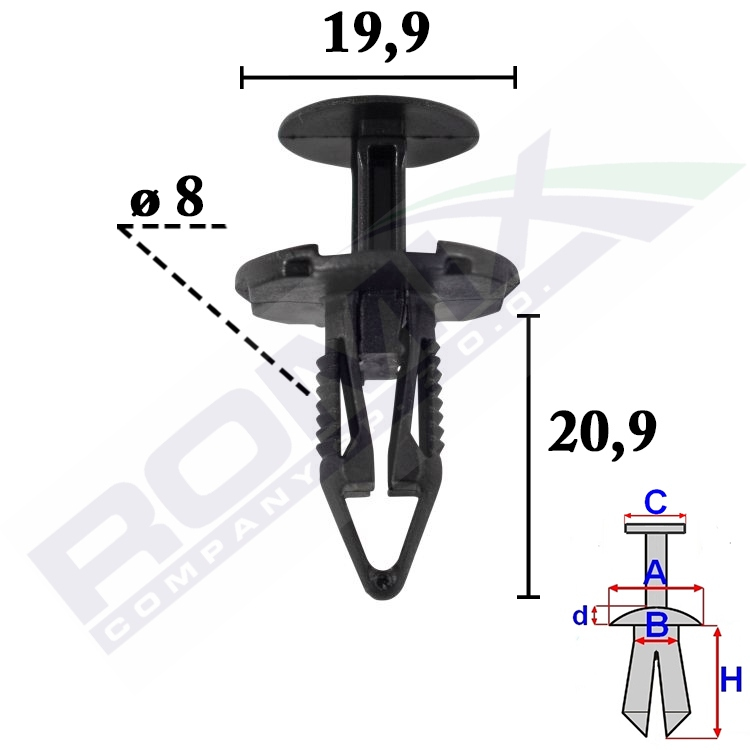 Wymiary: A 19,9 B 8 C 14,4 d 2,7 H 20,9 w otwór ø 8
