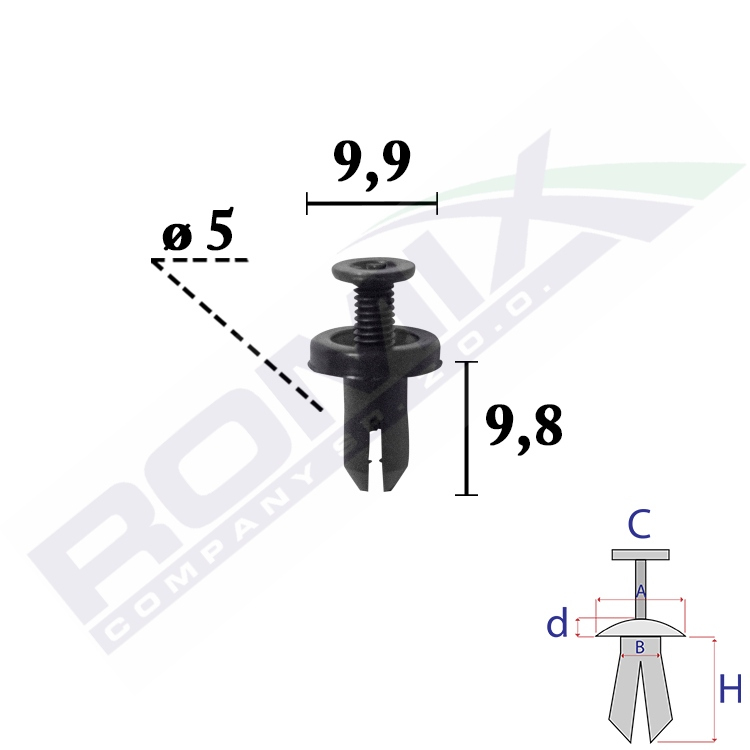 A 9,9 B 4,9 C 6,4 d 2,1 H 9,8 w otwór ø 5