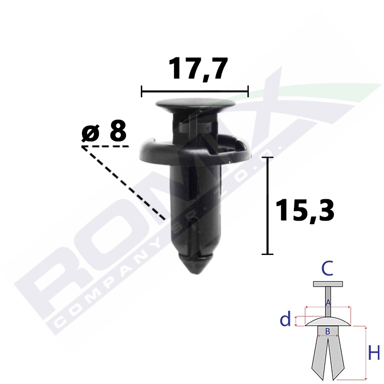 Wymiary: A 17,7 B 8 C 12,6 d 3 H 15,3 w otwór ø 8