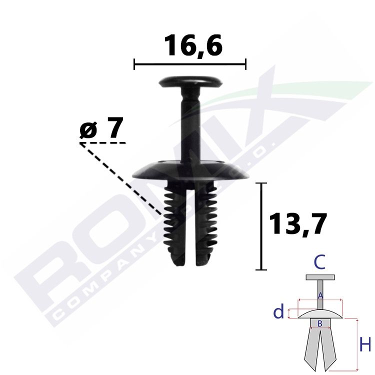 Wymiary: A 16,6 B 6,6 C 9,1 d 2,4 H 13,7 w otwór ø 7