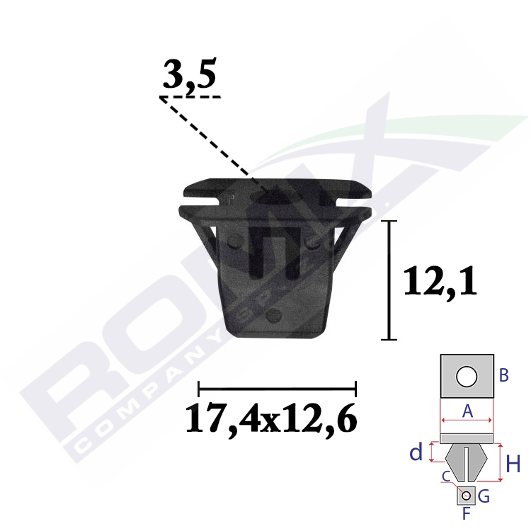 Wymiary: A 17,4 B 12,6 C 3,5 F 10,4 G 8,8 H 12,1