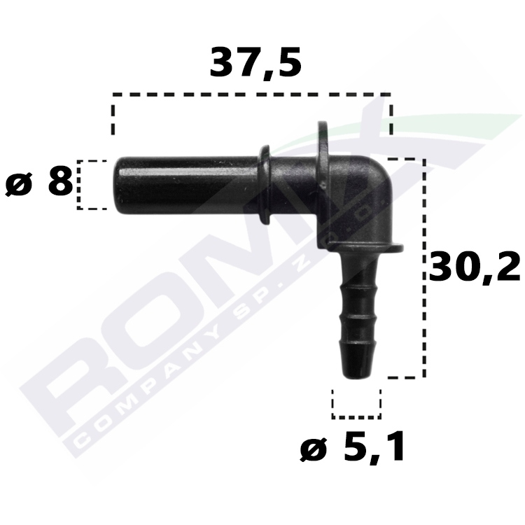 łącznik kolankowy ø 8/ø 5,1, szerokość - 37,5, wysokość - 30,2