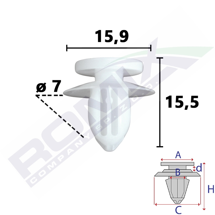 A 11,9 B 6,8 C 15,9 d 2,1 H 15,5 w otwór ø 7