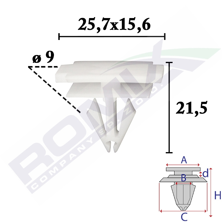 Wymiary: A 25,7x15,6 B 9 C 20x13,9 d 2,6 H 21,5 w otwór ø 9