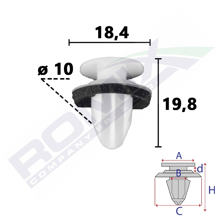Wymiary: A 14,9 B 9,6 C 18,4 d 3,4 H 19,8 w otwór ø 10