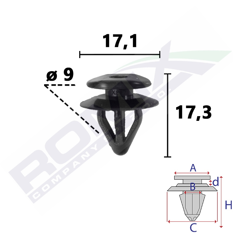 A 13,9x10,9 B 9 C 17,1 d 2,3 H 17,3 w otwór ø 9