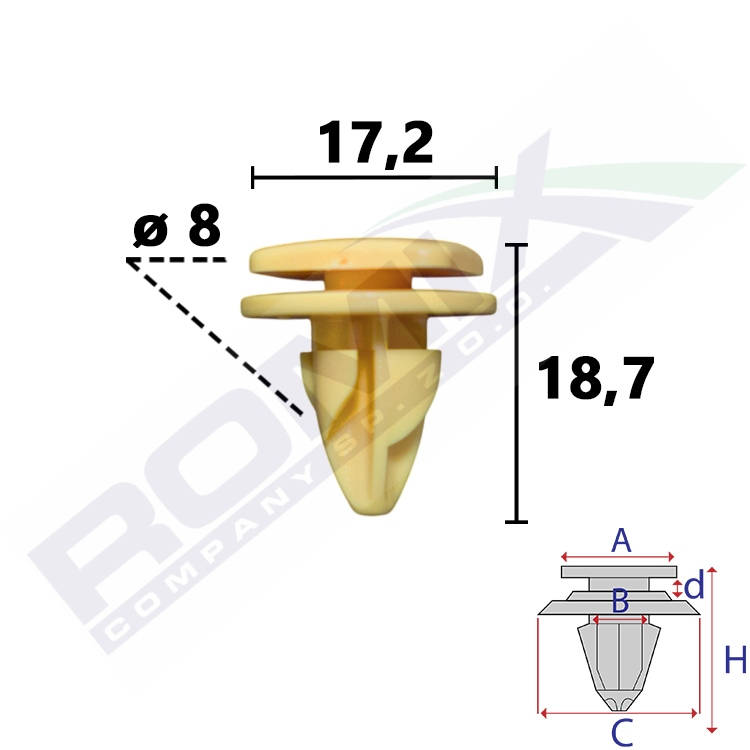 A 13,6 B 7,7 C 17,2 d 1,5 H 18,7 w otwór ø 8