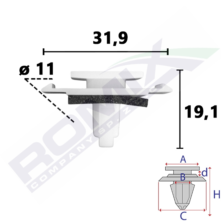 A 17,9x15,9 B 9,4 C 31,9x18 d 2,6 H 19,1 w otwór ø 11