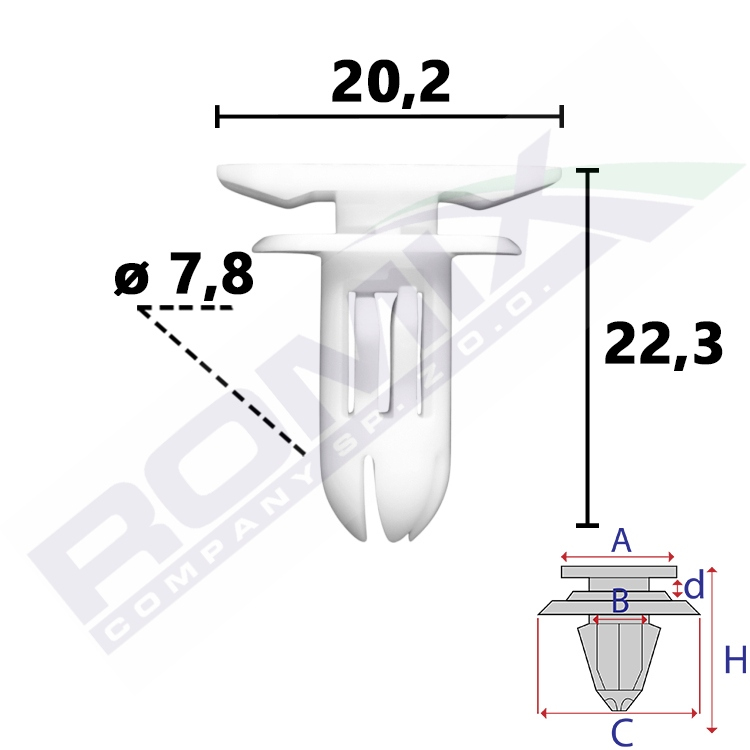 Wymiary: A 20,2x12,1 B 7,8 C 16,1x12,1 d 2,6 H 22,3 w otwór ø 7,8