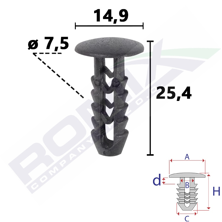 A 14,9 B 6,4 C 8 d 5,7 H 25,4 w otwór ø 7,5