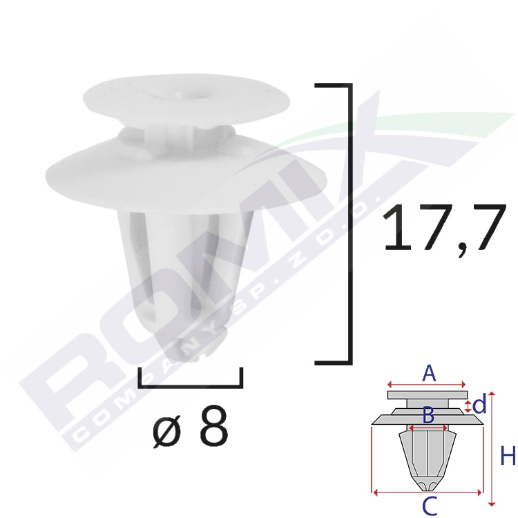 Wymiary: A 13,2 B 8 C 17,8 d 2,7 H 17,7 w otwór ø 8