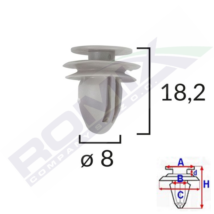 Wymiary: A 13 B 8,6 C 16,5 d 2,5 H 18,2 w otwór ø 8