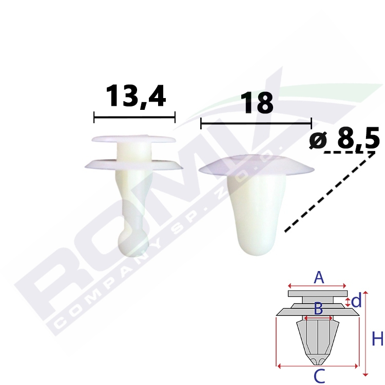 Wymiary: A 13,4 B 8,2 C 18 d 3 H 20,6 w otwór ø 8,5