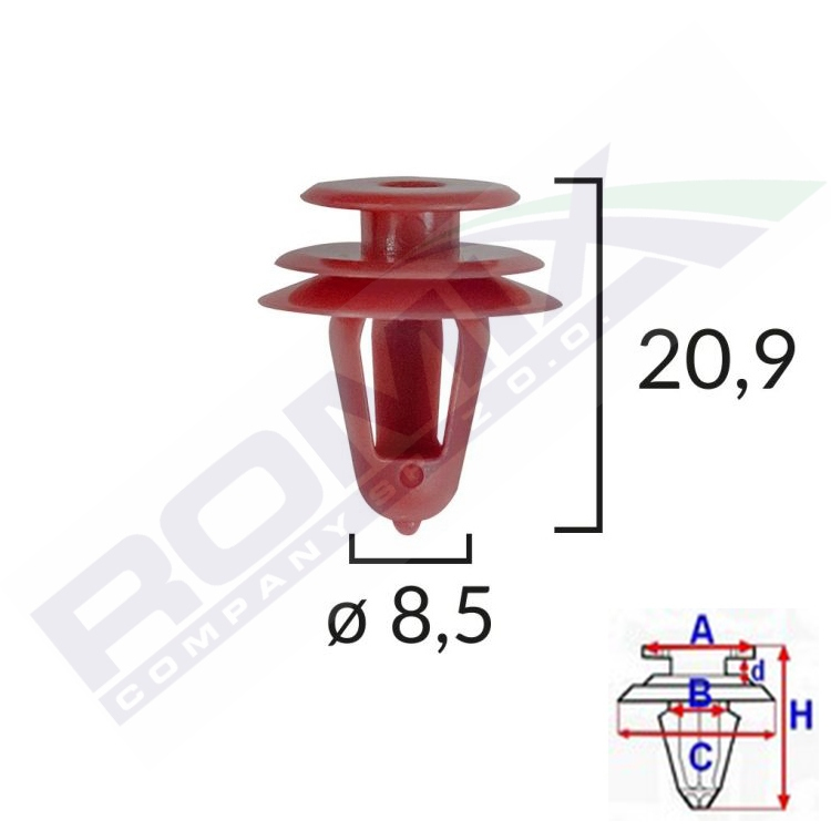 Wymiary: A 12,8 B 8,7 C 17,6 d 2,8 H 20,9 w otwór ø 8,5